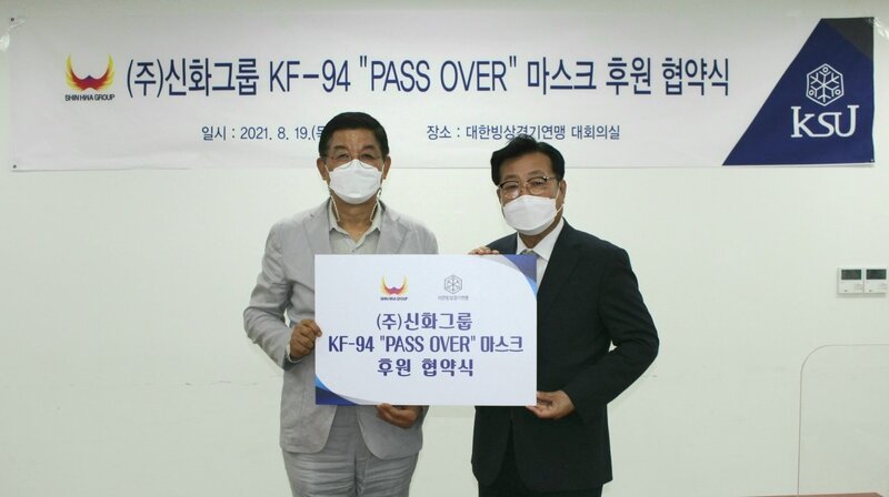 8월 19일 (목) 대한빙상경기연맹 회의실에서 ㈜신화그룹과의 공식 마스크 후원 협약식이 개최되었습니다. 이번 후원 협약을 통해서 ㈜신화그룹은 자사의 대표 제품인 KF-94 "PASS OVER" 마스크를 21/22 시즌 기간 대한빙상경기연맹에 제공할 예정입니다.