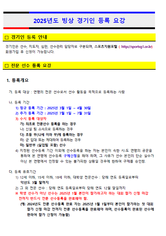 전국 시ㆍ도연맹 전국 시ㆍ도 공지사항 전국 시ㆍ도 공지사항 서울특별시 부산광역시 대구광역시 인천광역시 광주광역시 대전광역시 울산광역시 경기도 강원도 충청북도 충청남도 전라북도 전라남도 경상남도 세종특별자치시 제주특별자치도 제목(공고) 2025년 경기인등록 안내.2025-01-07 09:53작성자시도연맹첨부파일1.2025.1 빙상 경기인 등록요강(홈페이지 업로드) (1).pdf (154KB)1.경기인등록은 파일을 참조 하시길 바랍니다. 2.선수등록비 20,000원 (2025년부터시행). 선수이름으로 등록비,서류 확인되어야 등록이 완료됩니다. ※ 계좌번호 신한100-030-835223 인천빙상연맹 목록 이전제106회 전국동계체육대회 (피겨) 공식연습 일정 및 명단시도연맹2025-01-07다음제106회 전국동계체육대회 참여선수 정산 지침 시도연맹2025-01-06 Powered by MangBoard | 워드프레스 쇼핑몰 망보드
