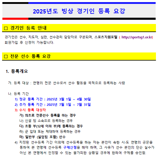 전국 시ㆍ도연맹 전국 시ㆍ도 공지사항 전국 시ㆍ도 공지사항 서울특별시 부산광역시 대구광역시 인천광역시 광주광역시 대전광역시 울산광역시 경기도 강원도 충청북도 충청남도 전라북도 전라남도 경상남도 세종특별자치시 제주특별자치도 제목(공고)2025년 빙상 경기인 추가 등록안내2025-06-12 11:23작성자시도연맹첨부파일2025년 빙상 경기인 등록요강.pdf (154KB)첨부파일 1.경기인등록 요강 *추가등록 기간 2025.7/1~7/31 까지 *팀별카드,개인별카드 소속장직인,개인별 상해보험 업로드 확인 *전문선수 경기인 등록비 20,000원. 선수이름으로 등록비,서류 확인되어야 등록이 완료됩니다. ※ 계좌번호 신한100-030-835223 인천빙상연맹 목록 이전제3회 인천광역시 빙상경기연맹 회장배 전국빙상대회 신청자명단및 안내사항시도연맹2025-06-20다음(공고) 제3회 인천광역시 빙상경기연맹 회장배 전국빙상대회 (쇼트)시도연맹2025-06-02 Powered by MangBoard | 워드프레스 쇼핑몰 망보드